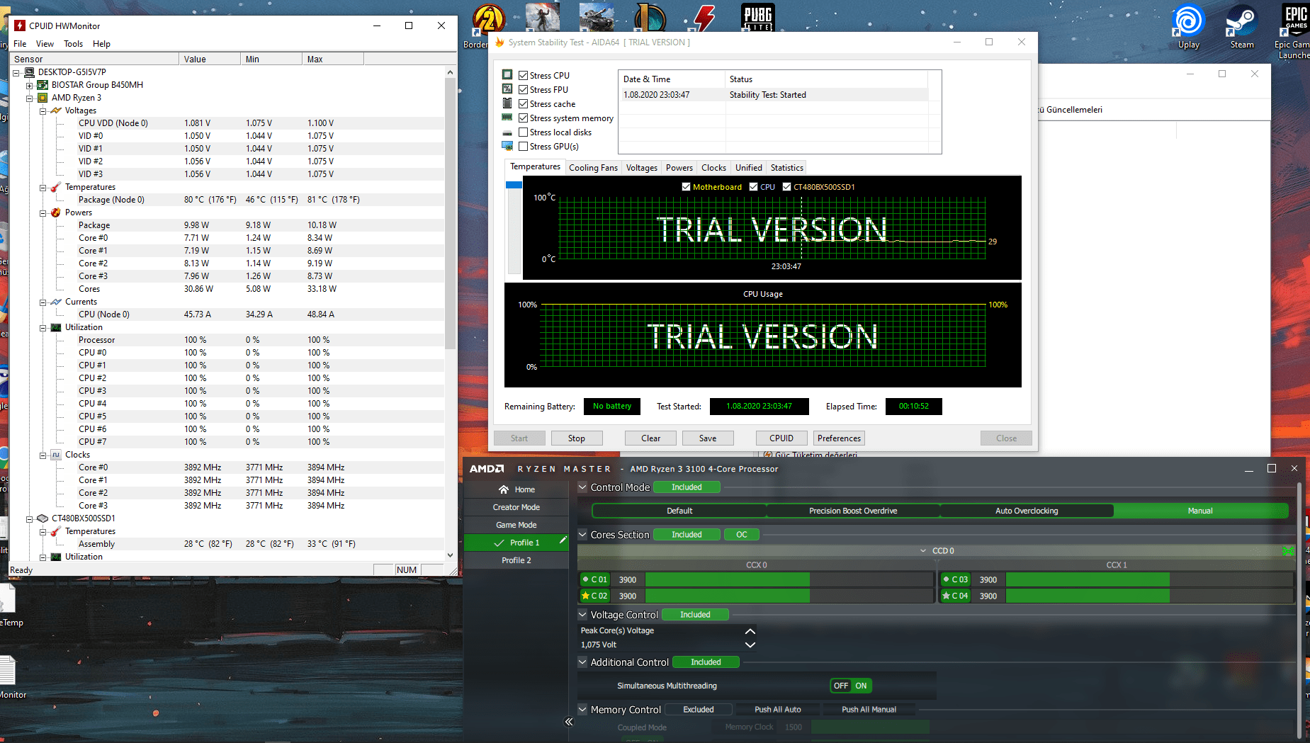 Amacım aslında tam olarak overclock değil. Turbo Boost'a verdiği 3.9 MHz hızı daha düşük işlemci sıcaklığında gerçekleştirmek için voltajı düşürmek istiyorum. İşlemcinin AIDA64 stress testinde ne kadar ısındığının resmini ekledim. İlk resimde gördüğünüz testi CPB'yi kapatmadan yaptım ve herhangi bir işlem yapmadım. Diğer resimde ise önce CPB'yi kapattım ardından Ryzen Master programı ile 3.9 MHz ve 1.075 Volt vererek test ettim bir sıkıntı olmadı ardından yine resimde göreceğiniz üzere AIDA64 testine soktum ve HWMonitor programı ile sıcaklığı kaydettim.