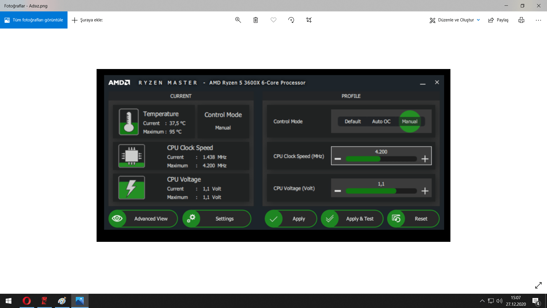 İlk olarak YouTube üzerinden izlediğim bir videodaki değerleri girerek OC olayına başladım. Ryzen Master basit arayüzünden manuel OC moduna alarak işlemci peak hızını 4.2 MHz'ye çıkardım ve CPU voltajını 1.2v değerine çektim (kendi değeri 1.4 küsurlerde gezmektedir). Ardından 15 dakika boyunca CPU-Z testine maruz bıraktım. Herhangi bir çökme olmadı ve test sonucunda işlemci Max. Sıcaklık değeri 66.16 derece oldu. Referans puanı ise 4114.8 puanda kaldı. OC öncesi bu puan daha düşüktü.