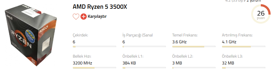 Şu an kullandığım işlemcim Ryzen 5 3500X, özellikleri ekte mevcut. L3 önbelleği 32 MB.