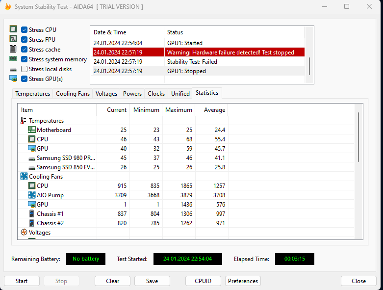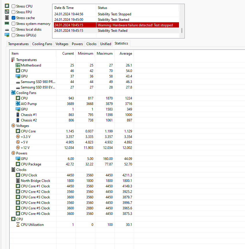 AIDA64 de ise hardware failure detected hatası veriypr stress cache kısmında ya da hepsini seçince fotografları yükledim kasam 4000X Ryzen 5600 B450 Plus Gaming 6700XT 32 GB Corsair RGB Pro 3600 MHz 2 TB Samsung 980 Pro Xigmatek scyla 240mm sogutma