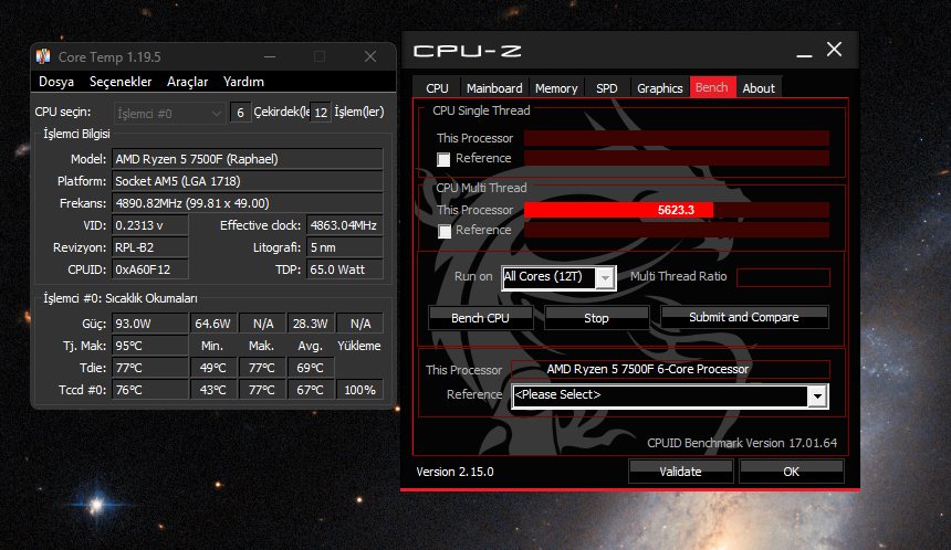 CPU-Z değil de OCCT veya C23 ile test yapın Core Temp yerine de HWiNFO 64 kurup sadece sensörleri açın oradan bakın ısı dereceleri nerelere çıkıyor? İşlemci Soğutucu ne var bu arada?