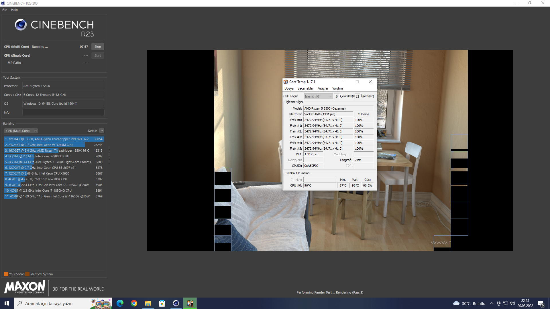 Şimdi sizlerin önerisine ihtiyacım var. Testlerde kullandığım CPU ölçme programları Core Temp ve HWMonitor. Bir de real tempi kullanmaya çalıştım ama işlemciyi algılamdığını söyledi. Yük bindirmek için Blender'dan render yaptım. Render'da hem işlemci hem ekran kartını %100 kullandırtım. Bunu da render sekmesinde CUDA sekmesi altında hem işlemciyi hem ekran kartını seçerek yaptım. Stok fan çalışıyor. Şu an akşam vakti testi yapıyorum ve hava 26 derece.