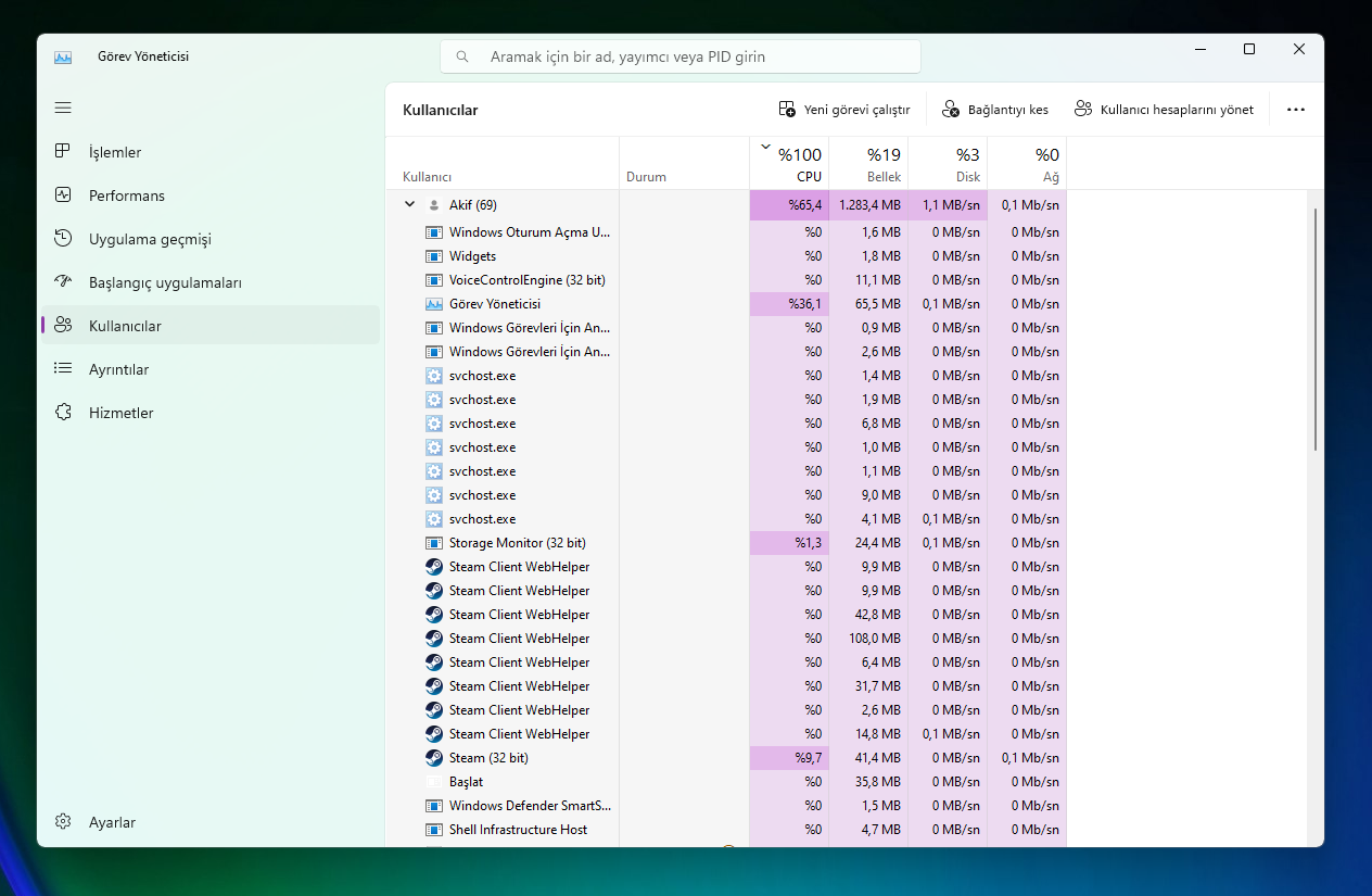 Görev yöneticisinde en cok CPU kullanan programları büyükten küçüğe sıralama yapabilir misin bir de ekran kartı modelin ne