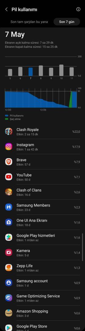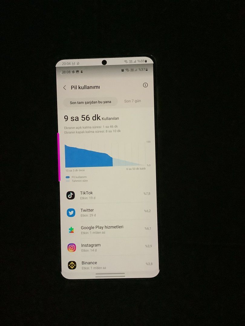 1 saat 46 dk açık ekran süresi almışım ve şarj %100'den %37'ye düşmüştü.