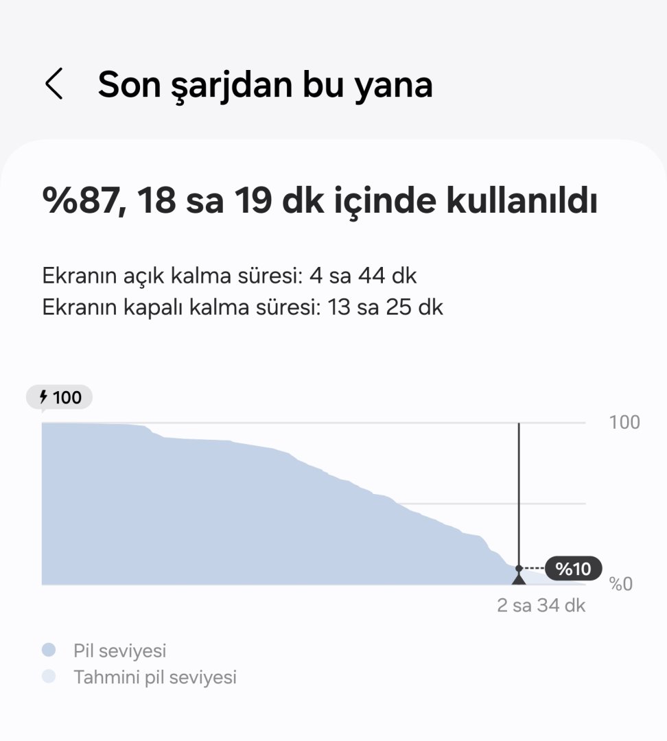 Çok yoğun kullandığım zamanlarda 5-6 saate düşebiliyor. Normal kullanımda ise buna yakın süreler alıyorum. Bluetooth devamlı olarak açık, akıllı saat bağlı. Mobil veri ve Wi-Fi'da aynı şekilde. Ekranı 120 Hz olarak kullanıyorum.