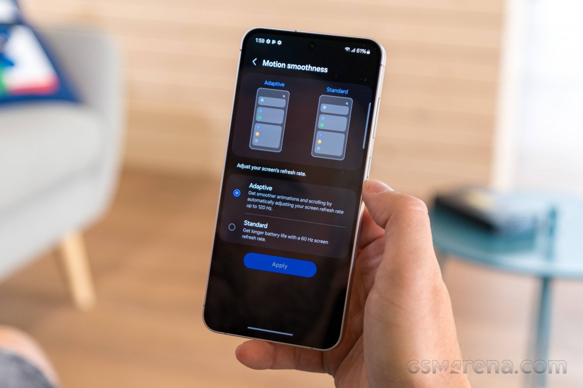 Galaxy S24 FE'nin standart (LTPO olmayan) bir ekranı vardır. Hareket Pürüzsüzlüğü modunu destekler - Uyarlanabilir (yenileme hızı) ve Standart (yenileme hızı). Açıklamaya göre, Uyarlanabilir olan farklı modlar arasında otomatik olarak geçiş yapar ve 120 Hz'e kadar çıkabilirken, Standart olan daha uzun pil ömrü için 60 Hz'de sabitlenmiştir.