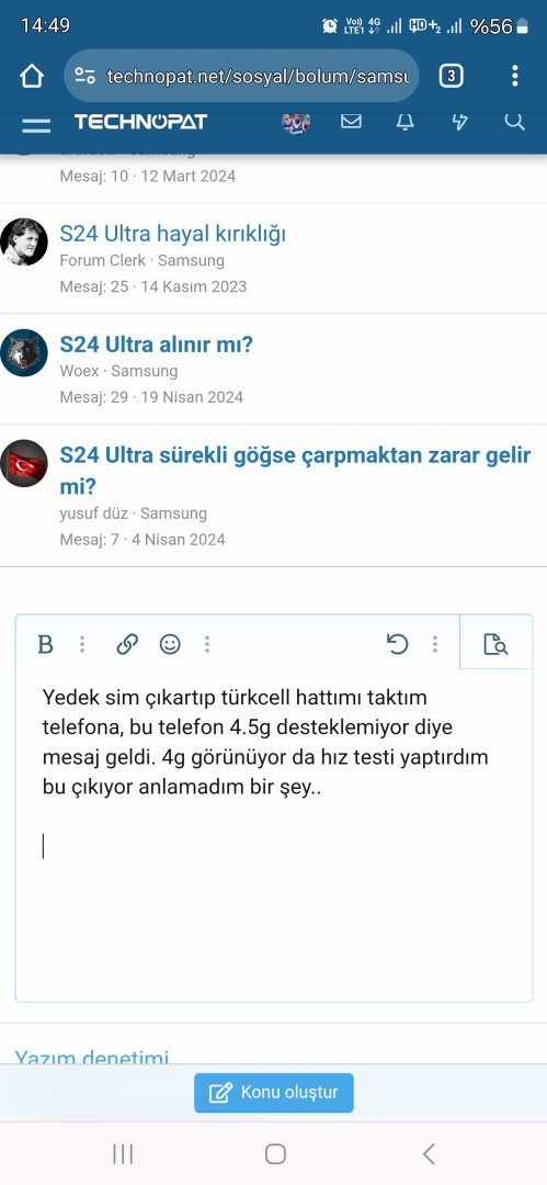 Yedek SIM çıkartıp Turkcell hattımı taktım telefona, bu telefon 4.5G desteklemiyor diye mesaj geldi. 4G görünüyor da hız testi yaptırdım bu çıkıyor anlamadım bir şey.