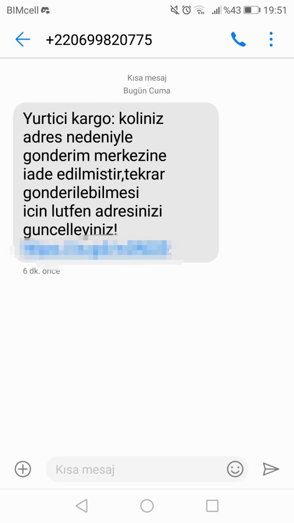 Maalesef dolandırıcılar yeni yöntemler buluyor. Tıpkı aşağıdaki örnekteki gibi kargonun size iletilemediğini iddia eden, linke tıklayınca ise sahte kargo firması sitesine yönlendirip sitede ise bilgilerinizi isteyen mesajlara dikkat!