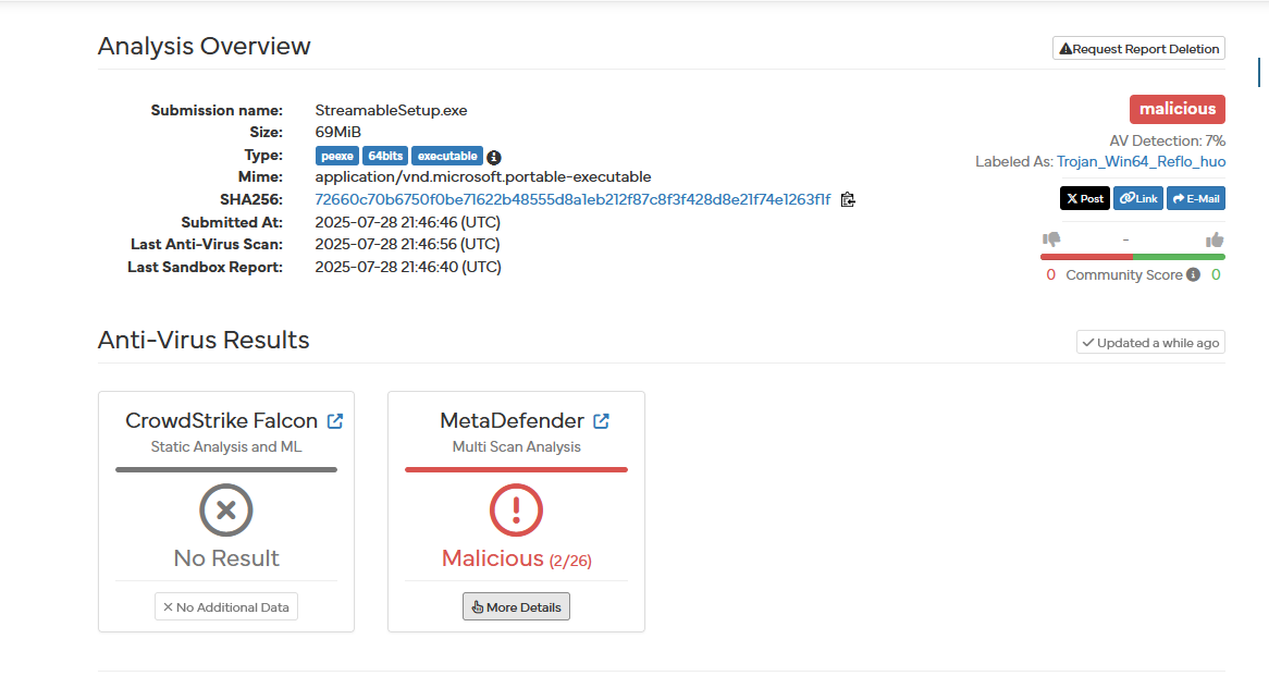 Bugün streamable sitesine dosya yüklemeye çalışırken sahte bir domain ile kandırıldım. Doğrudan bağlantıya tıkladım ve "upload file" seçeneğine bastığımda, bana sormadan bir dosya indirildi. Bu bir .exe dosyasıydı. Dosyayı çalıştırmadım veya tıklamadım; sadece bilgisayarıma indi ve 2. saniyede sildim.
