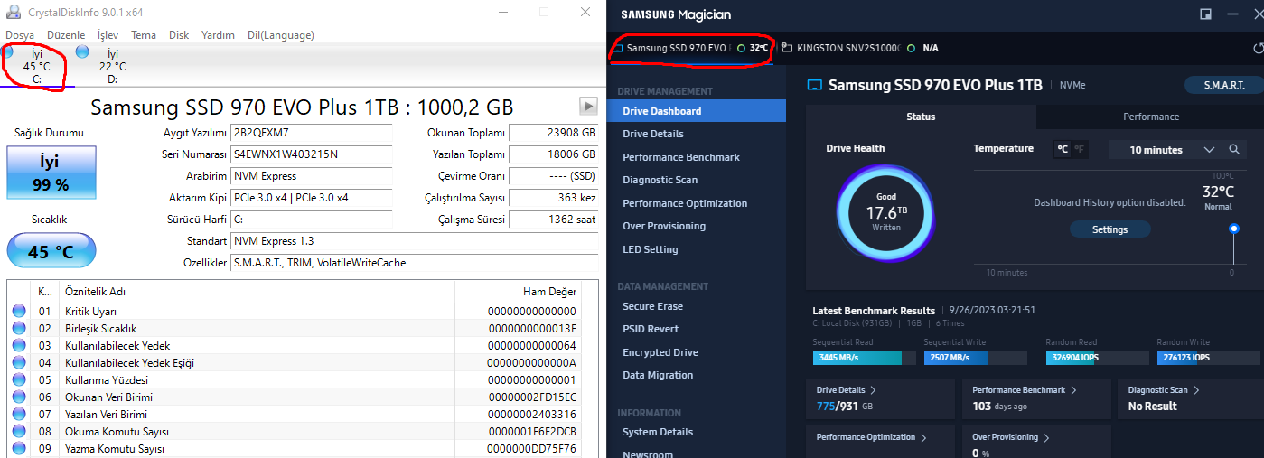 2023 Ekim ayının başları gibi Amazon Almanya'dan yaklaşık 1400 TL'ye Samsung 970 EVO Plus 1TB SSD'yi almıştım. Anakartım da ASUS B450M Dragon. Uzun zamandır gözüme çarpan bir durum var. bu SSD boşta 50 - 51 derece arasında dolaşıyor bu normal mi? Ve yazma hızı sürekli değişiyor. Altta ki ss Samsung SSD'nin bilgileridir.
