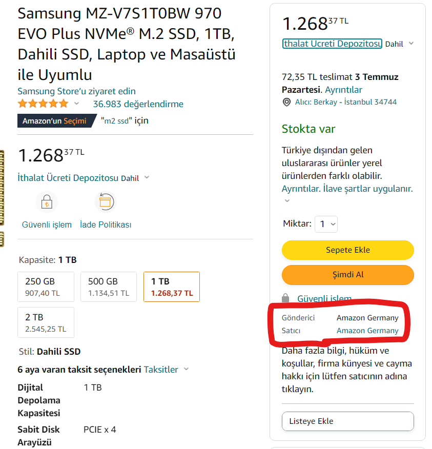 Farkı biri yurt içi fiyatı, diğeri yurt dışı. Yurtdışı alımlarda genelde gereksiz vergi ödemeleri yapmıyorsun. Bu senaryoda Amazon Almanya kendisi sattığı ve kargoladığı için daha ucuza geliyor, 226 tl gümrük vergisi dahil olarak . Pahalı olanda ise, kargolaması yine satıcıya ait olduğu için içinde kargo ücreti, genel vergiler, Amazon'a ödediği pazaryeri ücreti vb. şeyler var.
