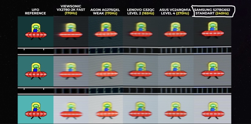 Samsung çok hızlı ama, VA olmasından ötürü Black smearing az da olsa var. Fark etmeniz düşük bir ihtimal ama, madem %90 FPS oynuyorsunuz ona göre bir model seçin. Black smearing ufonun yanındaki siyah iz oluyor. Hareket halinde olan bir durum.