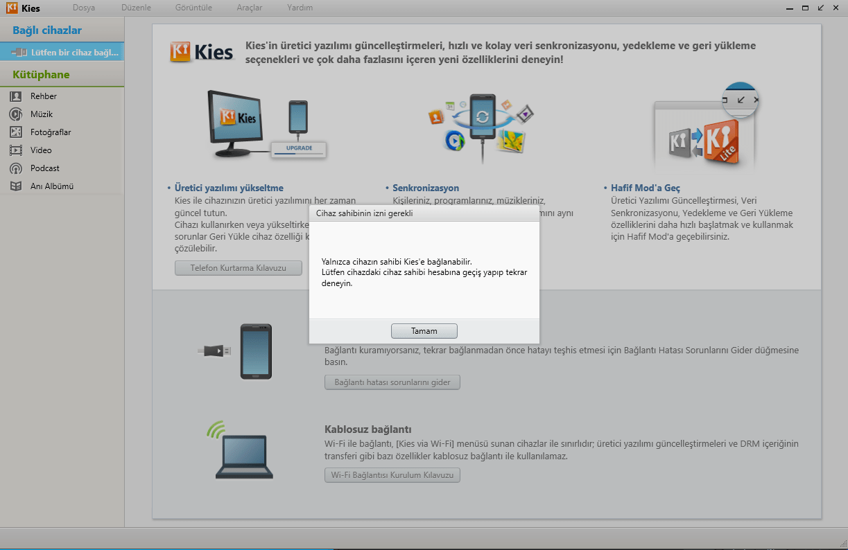 Telefon güncellenmiyor aynı hatayı veriyor. Wipe data/factory reset yapınca yine eskisi gibi oluyor. Telefon açık iken Kies programına bağlamaya çalıştım ve bağlayamadım, aynı resimdeki uyarıyı veriyor.
