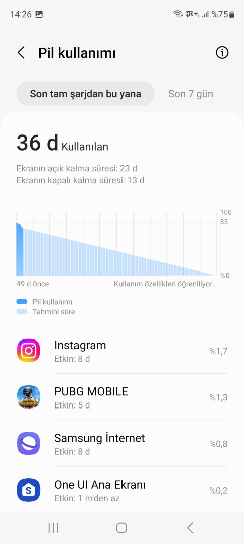 Ayrıca telefonu ilk kurduğumda bu kadar çok girmiyordu. Telefon bana ONE UI 4.1 ile gelmişti, üst üste 2 tane güvenlik güncellemesi ve 1 tane one ui 5.1 güncellemesi gelmişti. Bundan sonra uygulamaları kurdum, pil kullanımı cidden ama cidden çok tüketiyor.