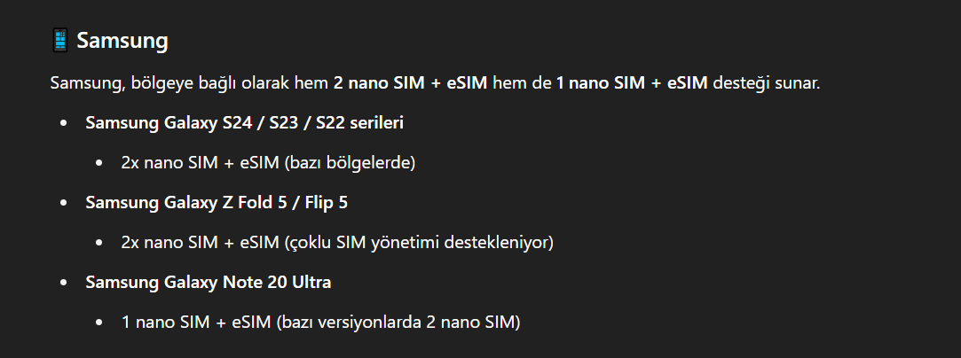 IPhone'da bir fiziksel, bir e-SIM oluyor değil mi? Mesela ben çift SIM + e-SIM istiyorum. Samsung'da bu durum nedir? Yurt dışı cihazlar için soruyorum.