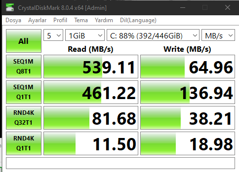 Kullandığım SSD SanDisk Plus 480 GB modeli. Yazma değerinin bu kadar düşük olması normal mi? Arkada sadece Spotify açıktı şarkı da çalmıyordu.