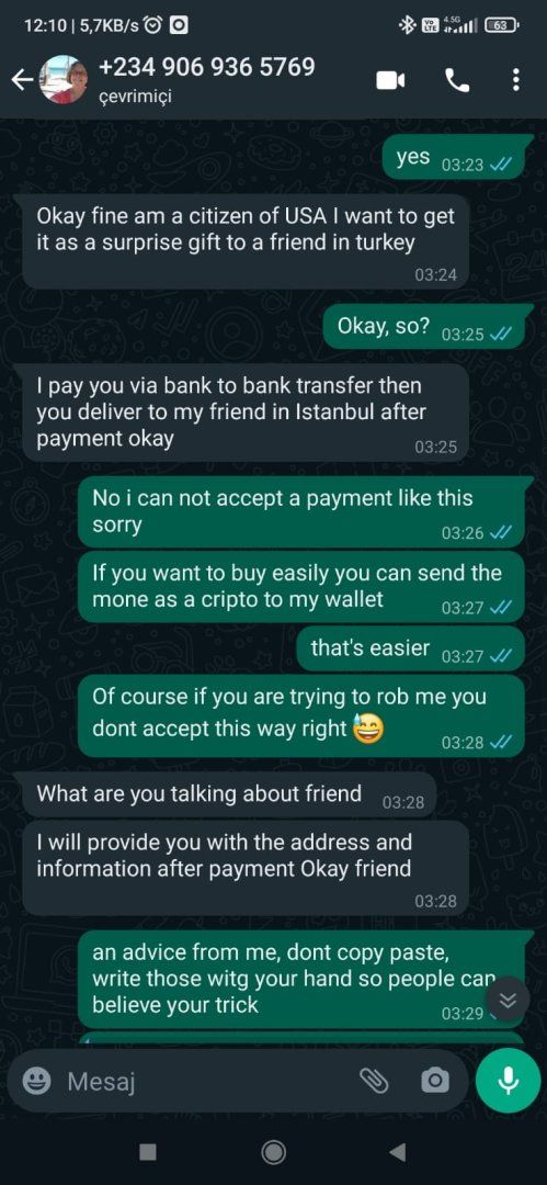 Merhaba. Bugün sizlere sarı sitede dönen bir dolandırıcılık yöntemi hakkında bilgilendirme yapmak istedim. Dolandırma teşebbüsünde olan şahıs ilk başta size WhatsApp uygulaması üzerinden yazıyor. Sonrasında size bir mail geliyor ve size ödenmesi gereken miktardan 2500 lira fazla olacak şekilde banka hesabınıza bankadan bankaya transfer uygulaması şeklinde bir para transfer talebinde bulunulduğu yazıyor mailde. Fakat 2500 lira fazla olmasının sebebi sizin bu transferi almak için "güvenlik" amacı ile 2500 liralık bir teminat ödemesi yapmanız gerektiğini söylüyor. 2500 Lira'yı ödüyorsunuz fakat sonrası... Bir de utanmadan kripto para cüzdan kodunu koymuş parayı buraya kolayca gönderebilirsiniz diye.
