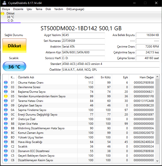 Yeniden konumlandırılan sektör sayısına bakılırsa diski yavaştan emekliye ayırmak iyi olur. Yeni bir diske geçmeni öneririm. Ayrıca Seagate'in Barracuda serisi hard diskleri sorunlu modellerdir. Bir dahakine uzak durmanı öneririm.