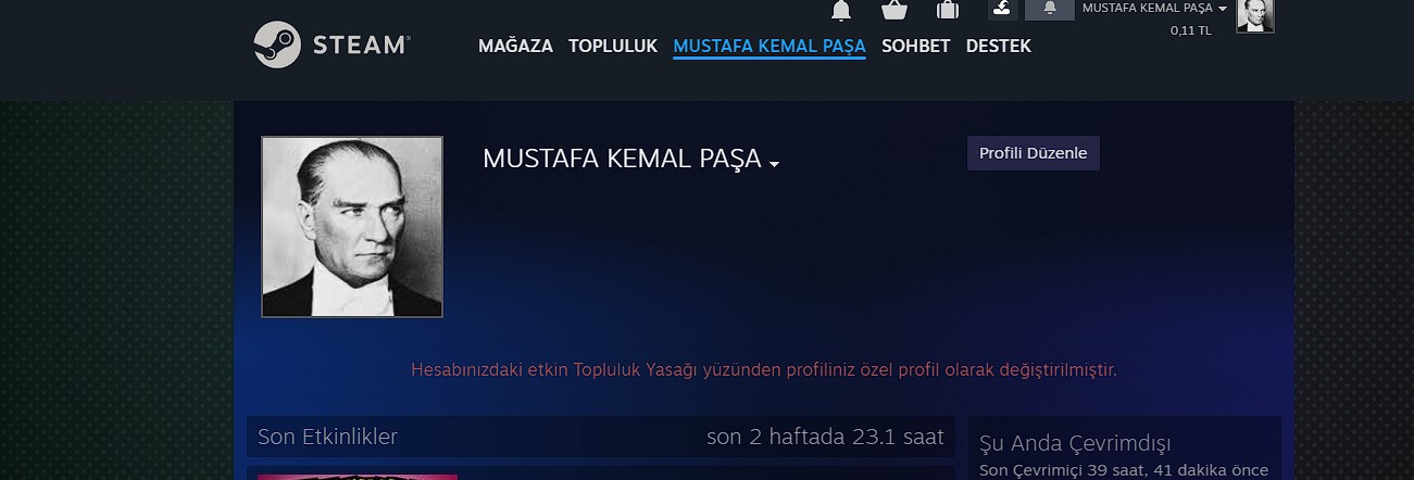 Steam'den topluluk banı yedim 2 gün önce hiçbir şey yoktu e-postamı değiştirdiğimi unutup sabah hesabı kilitlemiştim (e-postayı uyumadan önce değiştiğimi unuttum) sabah hesabı kilitledim sonra hatırladım e-postayı taşıdığımı açtım kilidini ve ayın 28'inde 00:00 da hesap ban yedi. Steam desteğe yazdım ilk e-postayı her türlü bilgiyi kartın son 4 hanesi adres fatura adresi vs her bilgiyi verdim. Daha sonra CD key etkinleştirmişim hesapta benim haberim yok onu istediler ama yok bilmiyorum bir ara internette beleş reklam izleyerek oyun keyi veriyorlardı ondan bahsediyorlar galiba demedim ama bunu veremedim sonra Steam cüzdan kodunun telefonla fotoğrafını istediler ama bayağıdır yüklememiştim ve faturayı bulamadım. İnternetten Papara üzerinden aldığım dekont fatura vs gösterdim ama hesabın sahipliğini hala doğrulayamıyoruz dediler her türlü adresi verdim. Ama doğrulayamadıklarını söylediler ve CD key ya da Steam cüzdan kodu fişinin fotoğrafını atmazsak bir şey yapamayacaklarını söylediler hesabın içinde bir ton oyun var ve 1000 saatten fazla saat olan CS:GO hesabı var ve hiçbir şey yapılmıyor o kadar saçma bir sistem ki sırf tekrardan oyun alsınlar para kazanalım diye yapıyorlar... Tam bir rezalet. Nasıl çözeceğimi hala bilmiyorum.