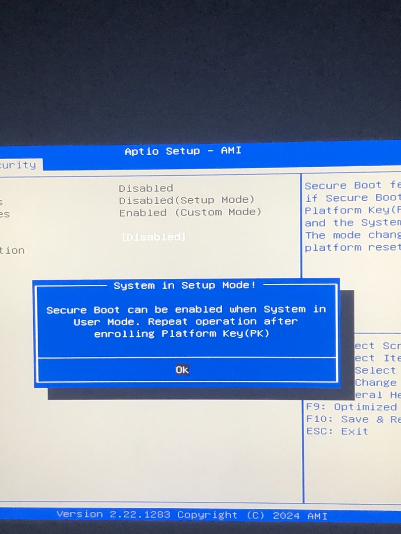 Selamünaleyküm. Öncelikle canım sıkıldı ve Valorant indirdim. Oyun sonrasında VAN9003 gibi bir hata verdi. Çözümüne baktım Secure Boot aktif hale getirmem gerekiyormuş. BIOS'a girince aktif edemedim şöyle bir hata aldım. Çözümünü bilen varsa yardım edebilir mi?
