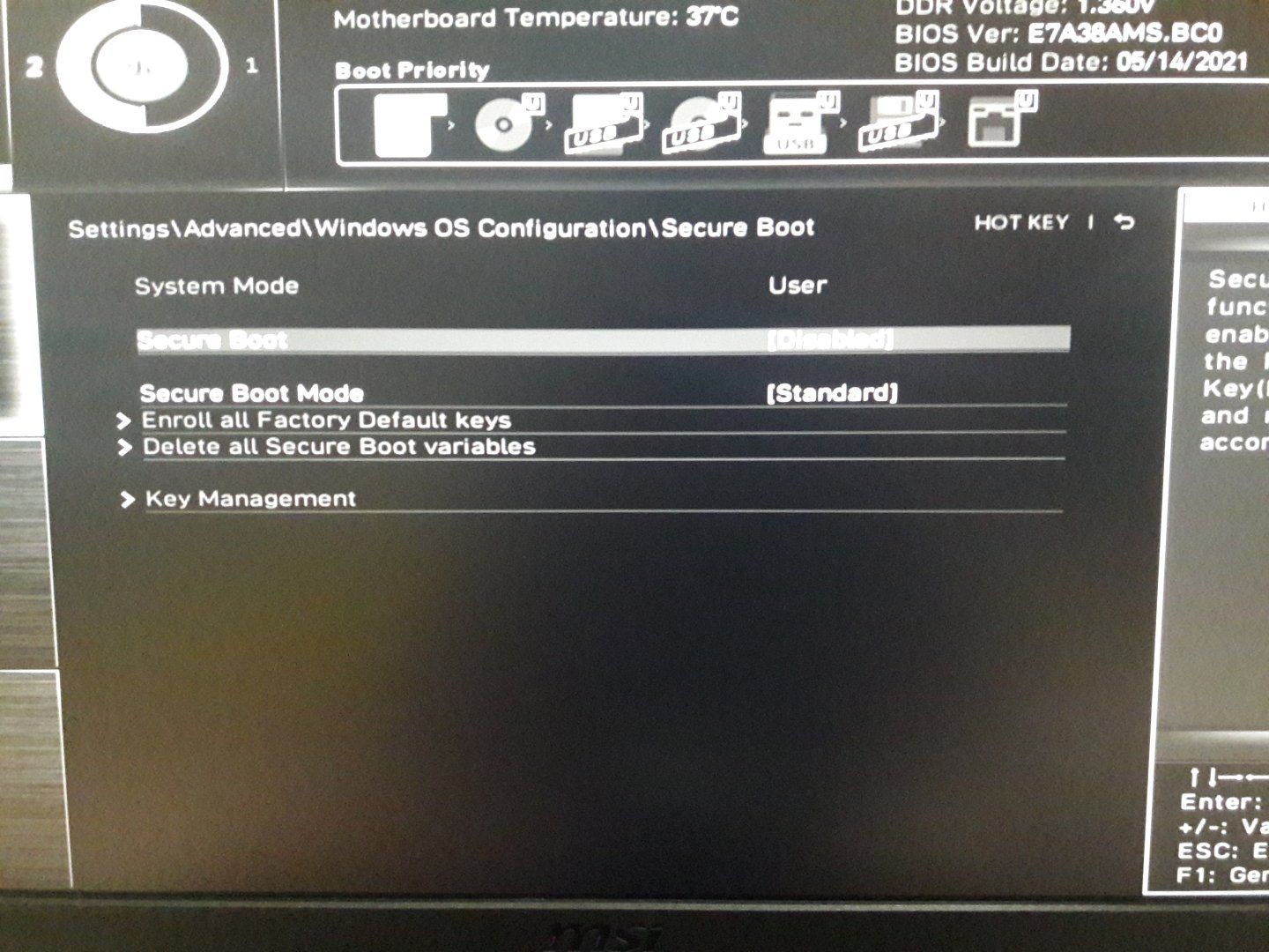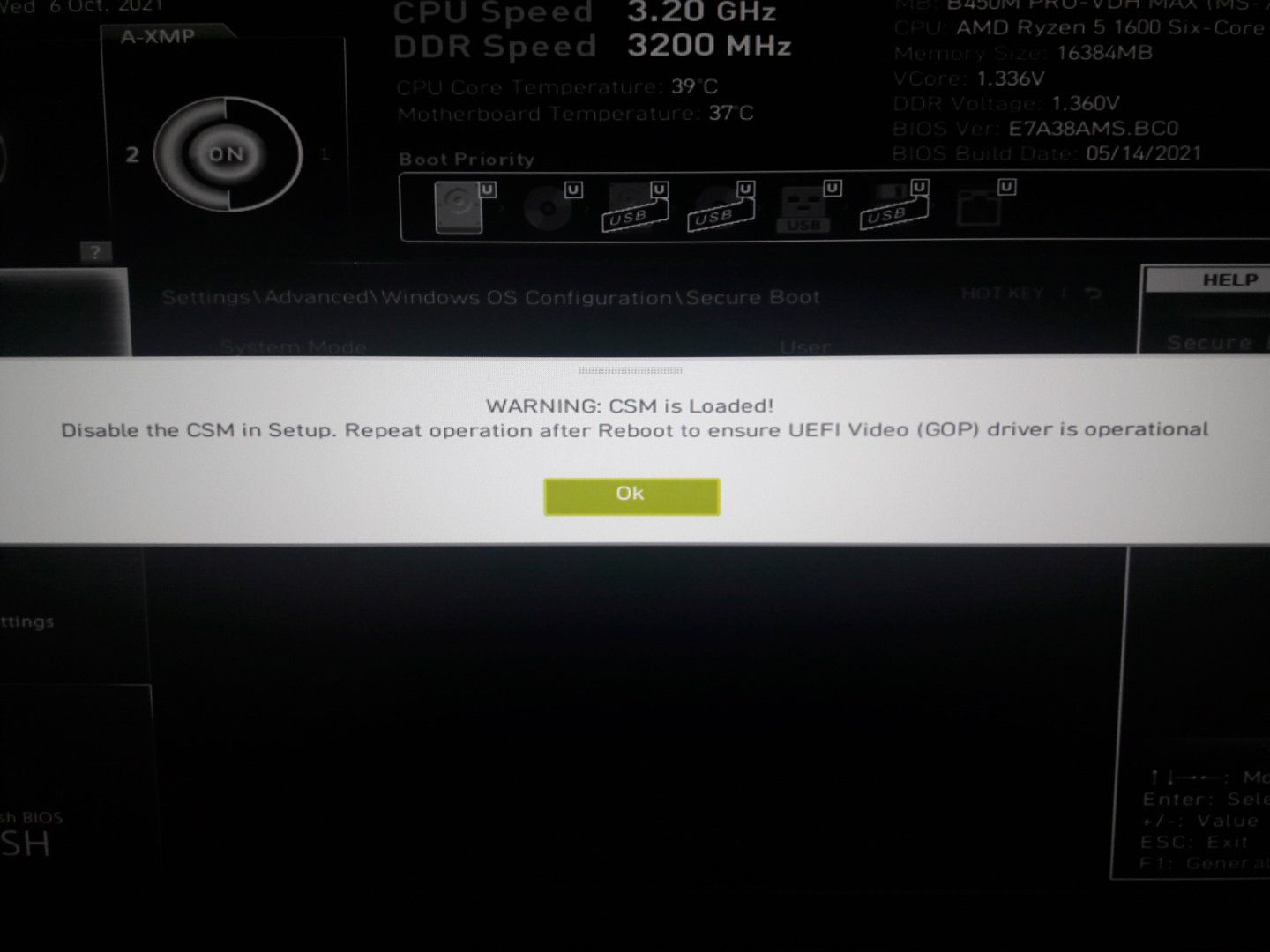 Disableddan Enabled'e getirdiğimde 2. görseldeki uyarıyı veriyor ve CSM'den UEFI seçip Secure Boot açamadan BIOS'tan çıkınca aşağıdaki görseldeki uyarıyı veriyor.