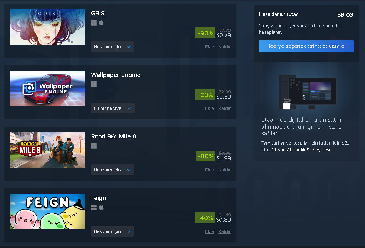 Blasphemous gayet iyi oyundur ve oda bayağı ucuzdur. Bir bakmanızı öneririrm. Onun dışında hocam bence Wallpaper Engine boş para ama siz bilirsiniz, sepetin gerisi ise gayet güzel.