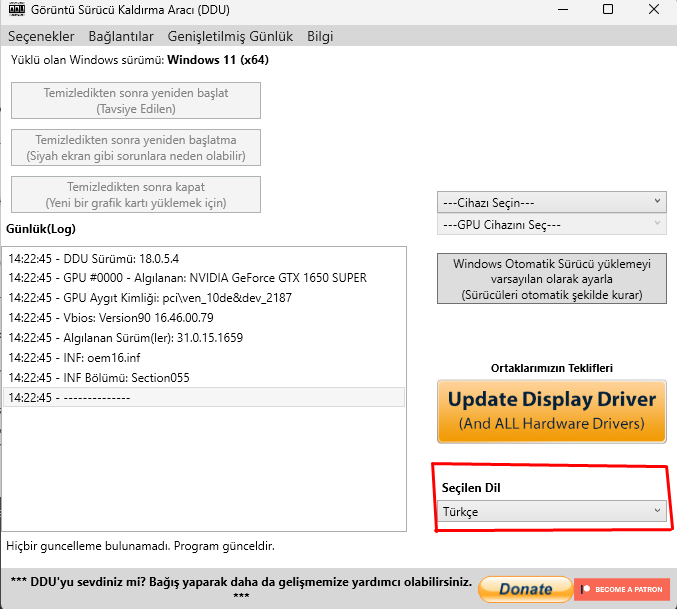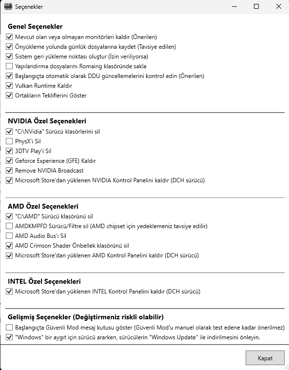 Bu kısımda hiçbir ayar yapmamıza gerek yok. Bu kısımdaki ayarlar, ekran kartı sürücü kaldırma işlemini alakadar eder. Direkt tamam deyip kapatabilirsiniz.