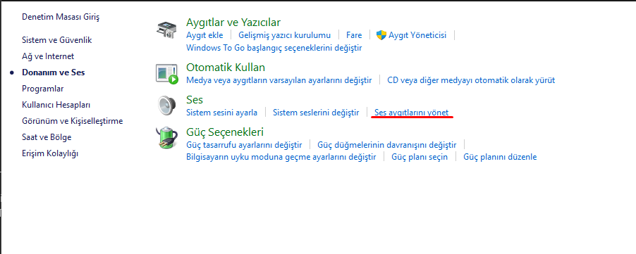 Denetim Masası - donanım ve ses - ses kısmında "ses aygıtlarını yönet" kısmına tıklayın.
