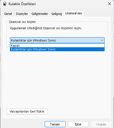 5. menüde uzamsal ses biçimini "Windows Sonic" yapın.