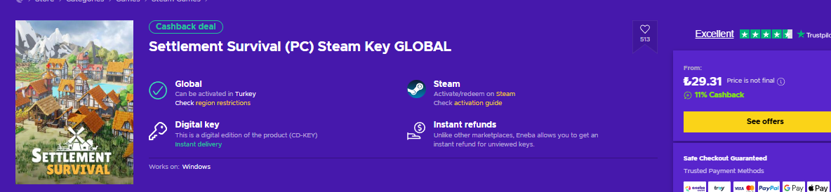 Eneba'da 29.31 TL, alacak olan oradan alsın bence: Buy Settlement Survival Steam key PC! Cheap price