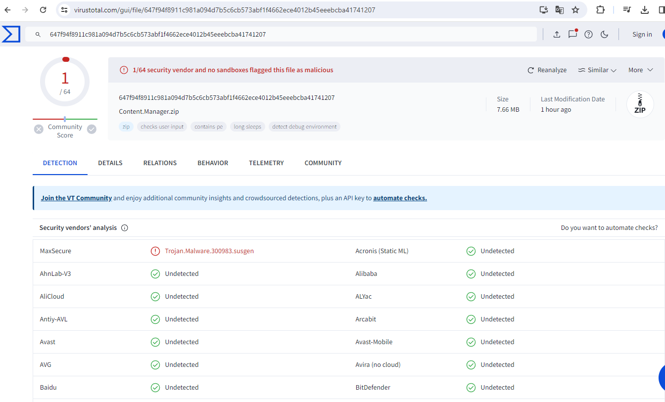 Content Manager indirdim. VirusTotal'de dosyayı tarattığımda 1 virüs buldu. Windows Defender kapalı. Content Manager mi virüslü Share mods mu anlayamadım. Öneriniz nedir?
