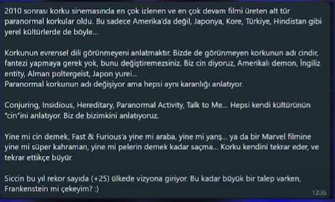 Yani nasıl başlasam bilmiyorum ama ya azıcık mantık ya siccin 7 de yanlış hatırlamıyorsam miras kavgasından dolayı büyü yapılıyor ve böyle başlıyor film siccin 8 de ise aile babaanneyi huzurevine koyuyor ve huzurevinden bir kadının kızı(zehra) bizim babaannenin oğlu Fatih'in önceden ilişki yaşadığı için ve bu ilişki sonucunda zehra *ntihar ettiği için bu kadın büyüyü yapıyor yanlış hatırlamıyorsam. Yani konular bu kadarla kalmamalı hep aynı döngü. Ya madem cin hikayelerine ve büyüleri bu kadar önemli bari her son aynı olmasın siccin 7'deki adam aya bakıyor AAA cinler gelecek diyor ve yeri buluyor kurtarıyor. Siccin 8'de ise aynı adam gene hisleriyle anlıyor ve gene kalanları kurtarıyor gene sonuç aynı yere çıkıyor. Eğer aynı siccin yönetmenleri tarafından yapılan bahar aylarında izlediğim filme bakarsanız oda aynı üç harfliler fal. Üç harfliler fal filminin sonunda gene bir başka bir falcı kurtarıyor. Bazı oyuncular bu saydığım filmlerin 2sindede oynamış yani aynı karakterleri görmek bayıyor daha iyi senaryolar görelim aynı döngü ve kısımları değiştirilmiş hikayeleri izlemek ve bazı rollerde aynı oyuncuları görmek bayıyor. Mesela siccin 7 ve 8'i sonunda gelip kurtaran adamı çıkar hikayeden başka biri ekle yani çok farklı şeyler yapılabilir. Gelelim korkutma kısmında korkutma ve rahatsız edicilik açısından güzel buldum favori sahnem sineğin tavandaki bir sensöre konduğu sırada ve çıkan jumpscare idi. Mesela geçen seneden bu yana çıkarılan 3 film bize senaryonun zayıflığını gösterir. Senaryo ve olay örgüsüne daha fazla önem verilmesi gerekiyor. Yani insanın bir de üstüne para verince beklentileri yükseliyor. Yorumlarınızı bekliyorum.
