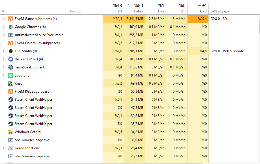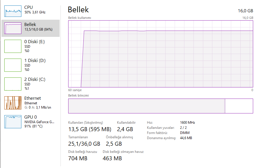 İyi günler. Bilgisayarımda 16 GB RAM mevcut. Görev Yöneticisi'nden ve bilgisayar ayarlarından baktığımda 16 GB kullanılabilir gözüküyor ancak denetim masasında kullanılan miktara baktığımda %88 90'lara ulaşan kullanım miktarı olmamasına rağmen öyleymiş gibi gözüküyor. Problem nereden kaynaklıdır çözemedim FiveM'de sürekli droplar yiyorum eskiden RAM'im 8 GB'dı o şekilde yemiyordum sonrasında takım şeklinde 2 tane 8 GB RAM aldım diğer oyunlarda böyle problem yaşamıyorum ama FiveM'de özellikle böyle sorun yaşıyorum.
