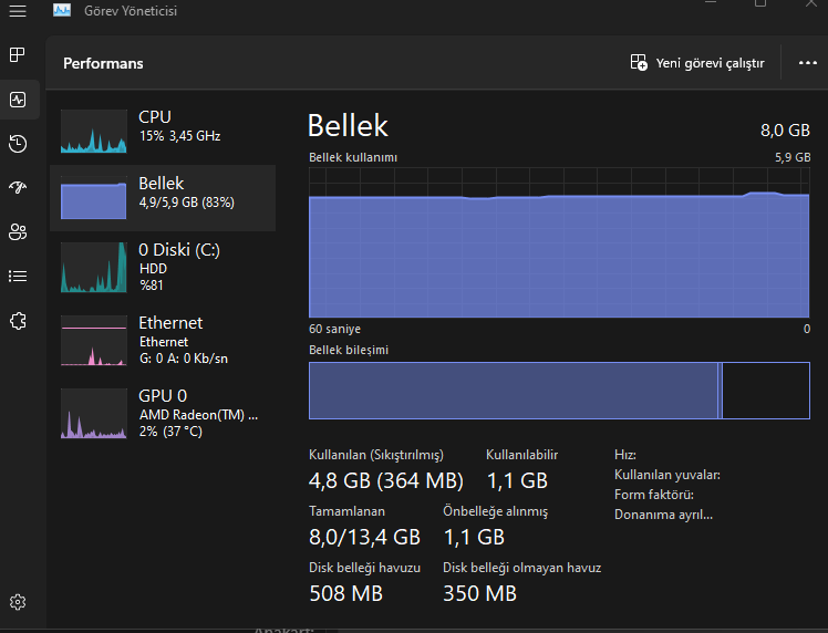 Bilgisayardan fazla anlamıyorum fakat bilgisayar şu an boşta ve böyle gözüküyor. Takılı RAM 8 ve sizce de bilgisayar boştayken 4.8 kullanması fazla değil mi?