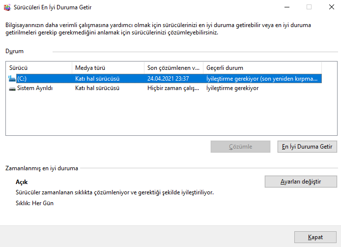 Buradan özellikler > araçlar > sürücüyü en iyi duruma getir seçeneğine tıklıyoruz