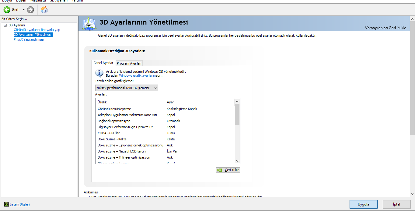 Pekala. Yan taraftan 3D ayarların yapılandırılmasına girin, program ayarlarına tıklayın. Ardından listeden oyunu seçin. Oyununuz gözükmüyorsa gözata tıklayıp kendiniz ekleyin. Bitirdikten sonra oyunu yüksek performansa alın. Bu sayede NVIDIA kartını kullanır.