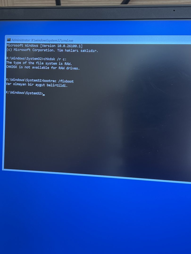 Bilgisayarımı dün gece oyun oynadıktan sonra kapattım sabah geri açtığımda önce mavi ekran oldu “UNMOUNTABLE_BOOT VOLUME” dedi daha sonra tanılama yaptı Windows kurtarma menüsünden onarım yapmaya çalıştım fakat işe yaramadı. Daha sonrasında araştırma yaptım CMD üzerinden belki düzeltebilirim diye, chkdsk yaptım fakat bana “The type of the file system is RAW. CHKDSK is not available for RAW drives.” dedi tekrar mavi ekran verdiğinde ise “CRITICAL_SERVICE_FAILED” dedi şuan bilgisayar açılmıyor diskim RAW formatına nasıl girdiğine dair en ufak bir fikrim yok, nasıl düzeltebilirim dosyalarımı kaybetmeden?