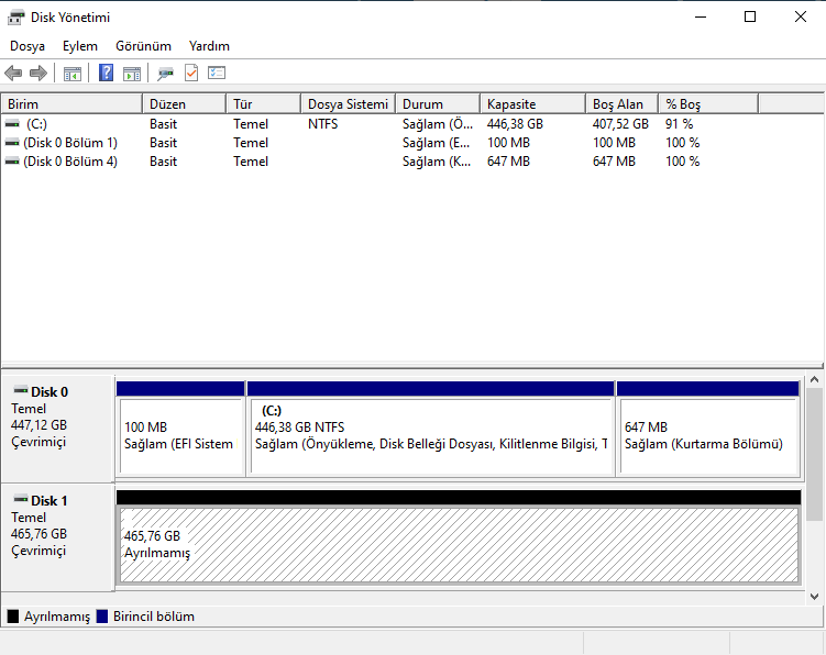 Acaba 2'ye bölünmüş diski birleştirmiş olabilri misiniz? Donanımsal olarak 2 tane var değil mi? Eğer varsa disk yöneticisinden bakın olmadı diskparttan CMD ile bakın.