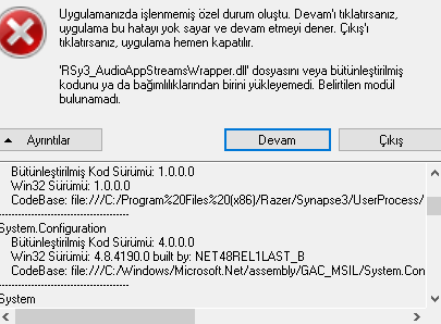 Merhaba, bilgisayarı her açtığımda Microsoft: .NET Framework 'RSy3_AudioAppStreamsWrapper.dll' dosyasını veya bütünleştirilmiş kodunu ya da bağımlılıklarından birini yükleyemedi. Belirtilen modül bulunamadı hatasını alıyorum, bir çözümü var mıdır?