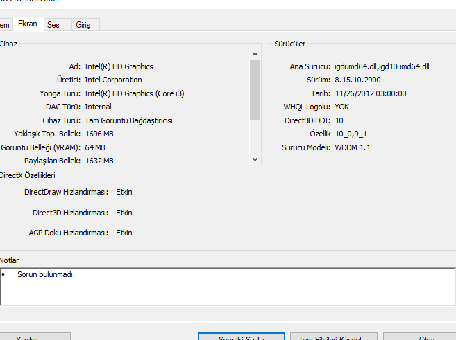 Hocam ben bir şey daha fark etim DxDiag bölümünde işlemci yok diyor.
