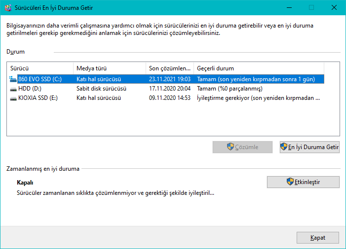 Arkadaşlar benim sistemde 1 adet 860 EVO SSD, 1 adet HDD ve 1 adet de Kioxia SSD mevcut. SSD'lerin ömrünü kısaltmaması için disk birleştirmeyi kapatmıştım ama 860 EVO için (son yeniden kırpmadan sonra 1 gün) gibi bir ifade var. Son çözümlenen veya iyileştirilen tarih de 23 Kasım 2021 görünüyor. Diğerleri 2020 görünüyor. Ekran görüntüsü: