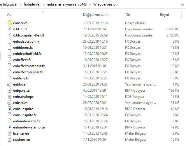 Şimdi indirdiğimiz ENB klasörünü çıkartalım ve içindeki her şeyi yine Skyrim.exe'mizin bulunduğu klasöre atalım.