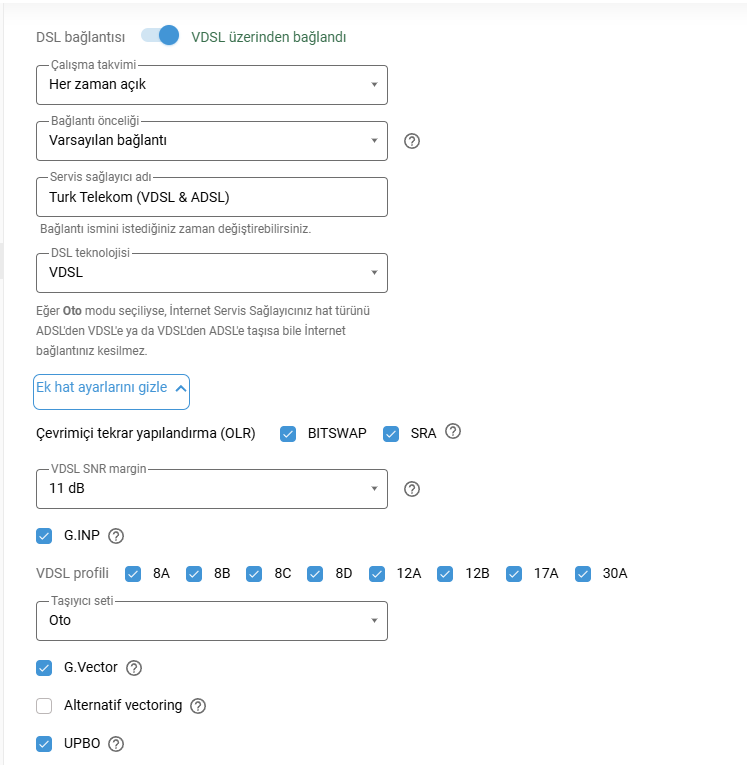 VDSL altyapıya sahibim ve paketim 100Mbps indirme 20Mbps upload paketi ve varsayılan SNR margin değerini ayarladığımda hızım asla 100'e çıkmıyor, testlerde 80-85'e takılıyor fakat bu yapmış olduğum değerlerden hangi değerde kalmam gerektiğini anlayamıyorum. Düşük değer yaptığımda 100'gördüğümde bazı saatlerde YouTube dahi açılmıyor saçmalamaya başlıyor.