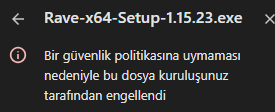 Sonunda EXE olan bir dosya indirmek istediğim zamanda hata alıyorum. Sonunda .exe ile biten örneğin: https://app.rave-web.com/windows gibi uygulamaların dosyasını indiremiyorum. Böyle durumlarda arkadaşlarımdan rica edip dosya. T.C. Üzerinden WinRAR'a atılmış ZIP dosyası şeklinde yükledikleri formları üzerinden indirebiliyorum. Çıkan hataı görsel de ekledim.