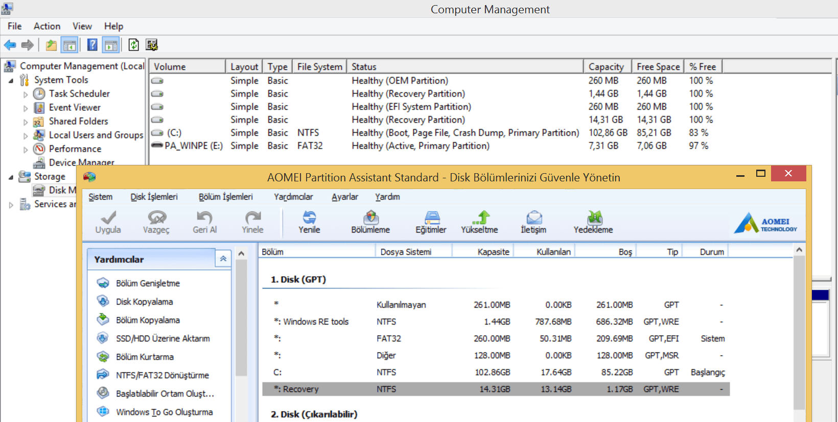 Not2: Tekrar inceledim. Ekteki resimde de görülebileceği üzere Aomei Partition Asistant ile Windows'un computer management'ında görülen disk detayları farklı. Windows boş diyor, AOMEI dolu diyor. Bu durum recovery dosyaları zarar gördü mü demek? Recovery'den kendim bootable disk yapmayı düşündüm ama dosyalarına erişemiyorum. Harf atadım, bölümü göster dedim (gizli dosya ve klasörleri göster de açık) yine erişemedim.