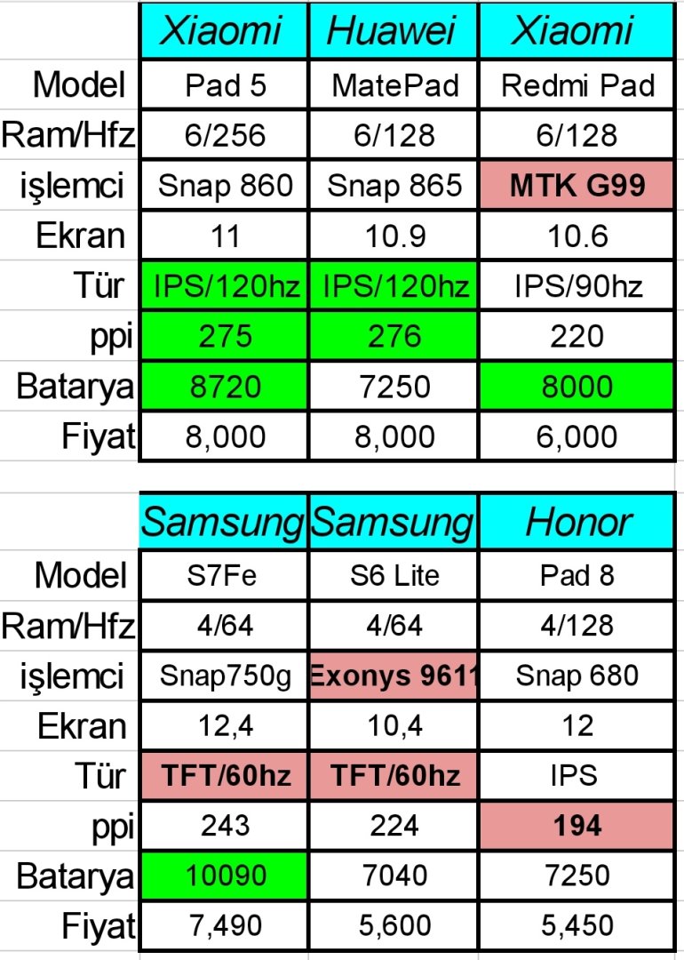 Xiaomi pad 5: Cihaz en pahalısı. Teknik özellikler iyi fakat yazılımsal sorunlar var deniliyor.