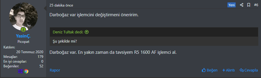 Arkadaşımız Intel 6700 kullanıyor, gelmiş @YasinÇ. arkadaşımız "darboğaz var, 1600 AF al" yazıyor. Ne alaka 1600 AF peki? Hiçbir alakası yok... Konu sahibinin sistemi dahi desteklemiyor 1600 AF'yi. Arkadaş bilmeden gidip o kadar parayı basıp 1600 AF alsa sonra gelip bu arkadaşa saydırsa haklı mı? Haklı.