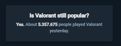 Zaten anlattım. Anlamadın, üstüne fotoğraf attım.Yani şöyle anlatayım, OYUNDA AYNI ANDA BULUNAN 1 MİLYON 300 BİN KÜSÜR KİŞİ olmuş CS:GO tarihinde, bakın AYNI ANDA OYUNDA BULUNAN diyorum çünkü anlaşılan anlamıyorsunuz. Valorant için ise bu sayı 6 MİLYON KÜSÜR KİŞİ.