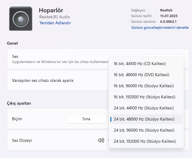 Bir de hocalarım bu ses çıkış ayarlarında biçim yazıyor o değer ne olmalı acaba? Bu ayarı ellemeli miyim?