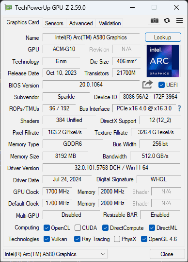 İnceleme Sparkle Intel Arc A580 ORC OC